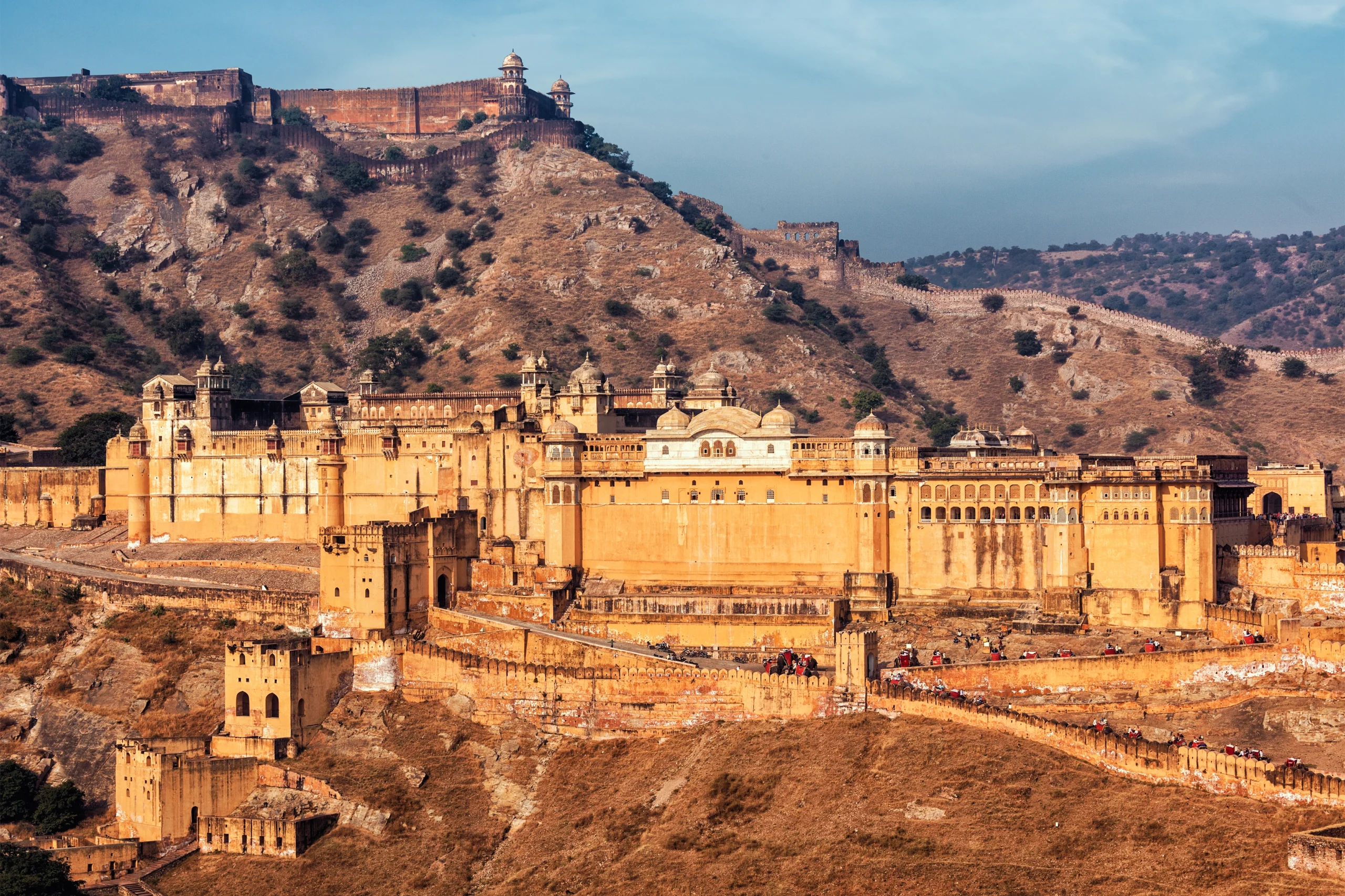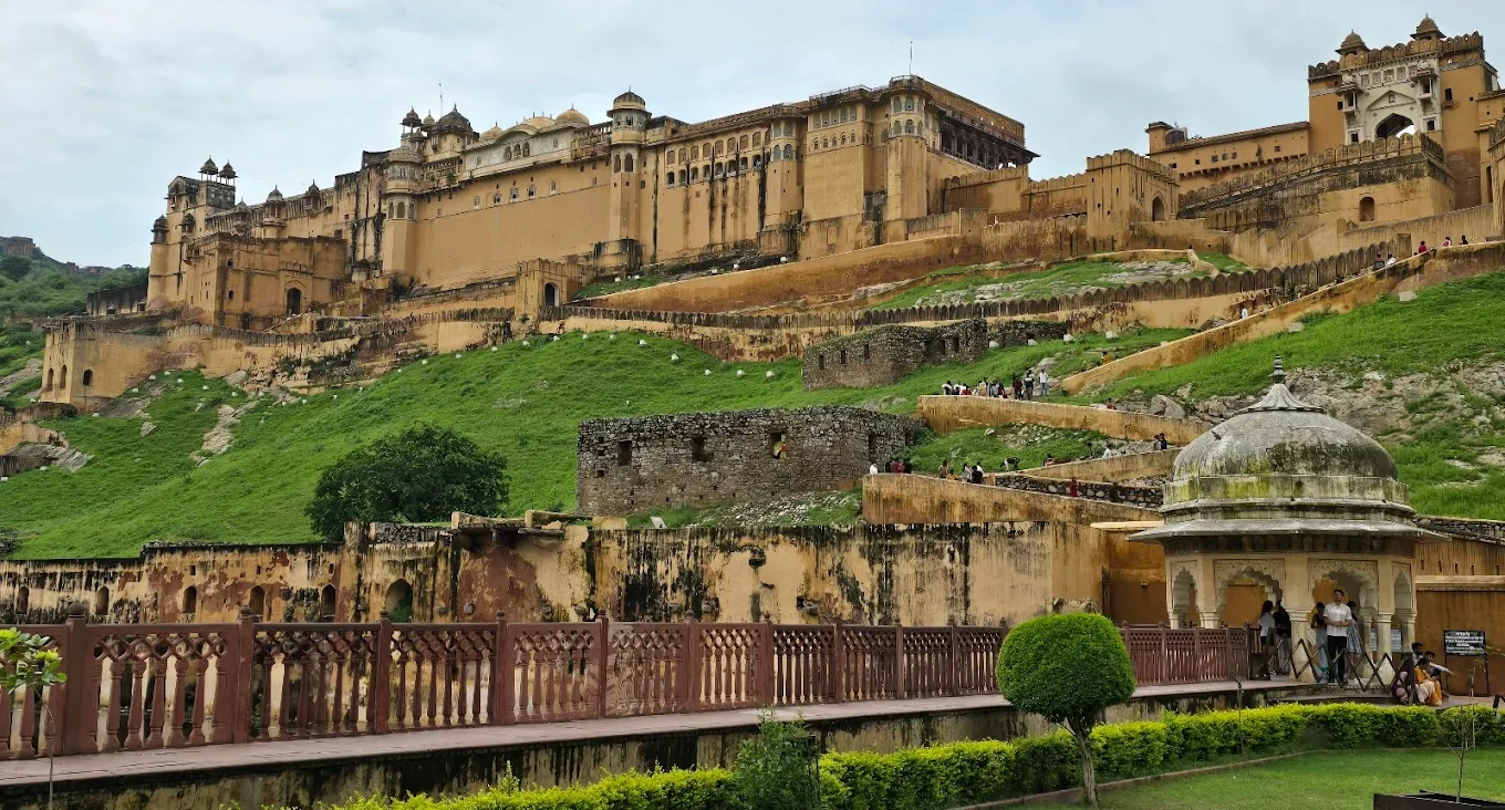 Tour the opulent mirror and hall‑courts of Amber Fort, once accessed by elephant—and now more ethically by jeep—perched above serene Maota Lake